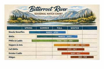 The Bitterroot is best known for dry-fly and dry-dropper fishing, particularly from late spring through early fall. Spring brings strong runoff and excellent streamer fishing, summer offers prolific hatches and terrestrial action, and fall delivers aggressive pre-spawn browns. Even in winter, patient nymphing can produce quality fish.